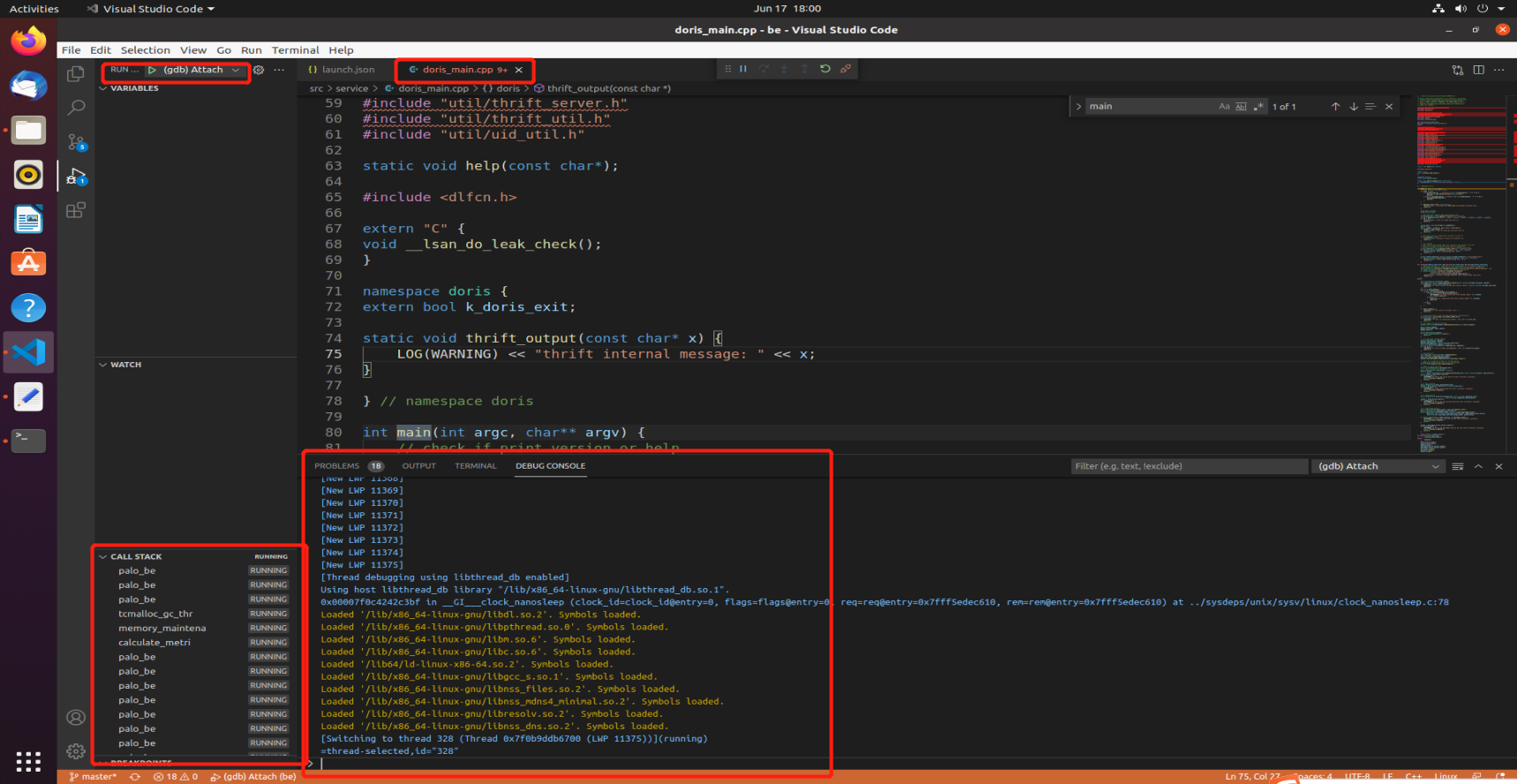 In the configuration "request": "attach", "processId": PID, these two configurations are the key points: set the debug mode of gdb to attach and attach the processId of the process, otherwise it will fail. The command below can directly extract the pid of doris' BE: