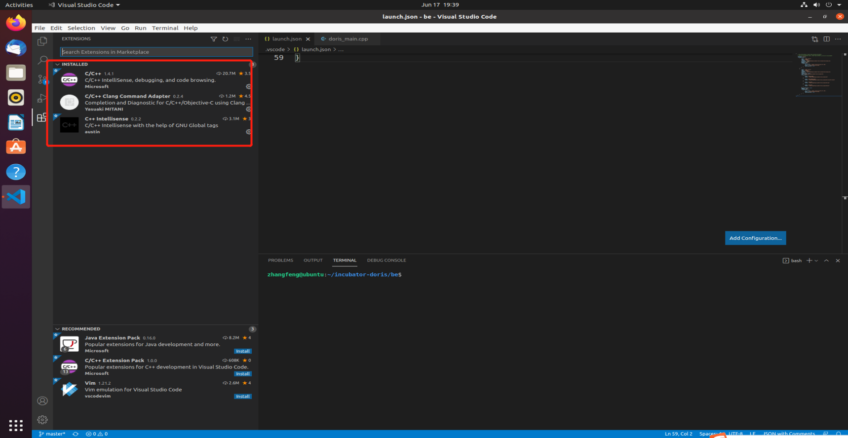 1. Open vscode, and open the directory where the be source code is located. In this case, open the directory as /home/workspace/doris/,For details on how to operate vscode, refer to the online tutorial