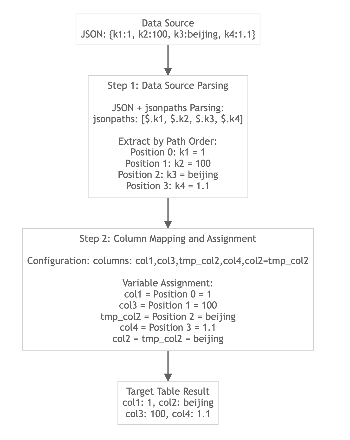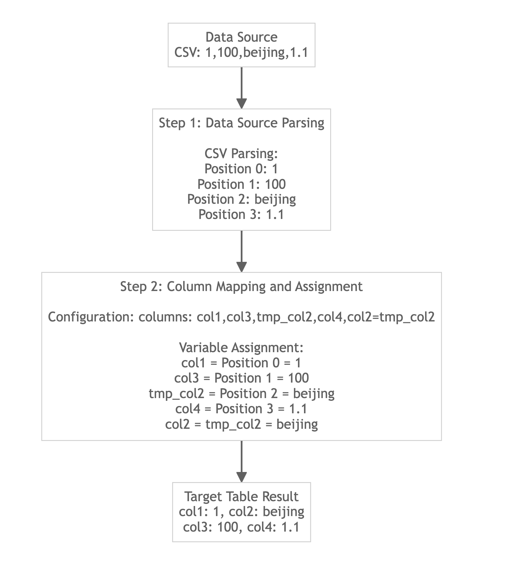 - ステップ1:データソース解析 - データ形式に基づいて生データを中間変数に解析する
